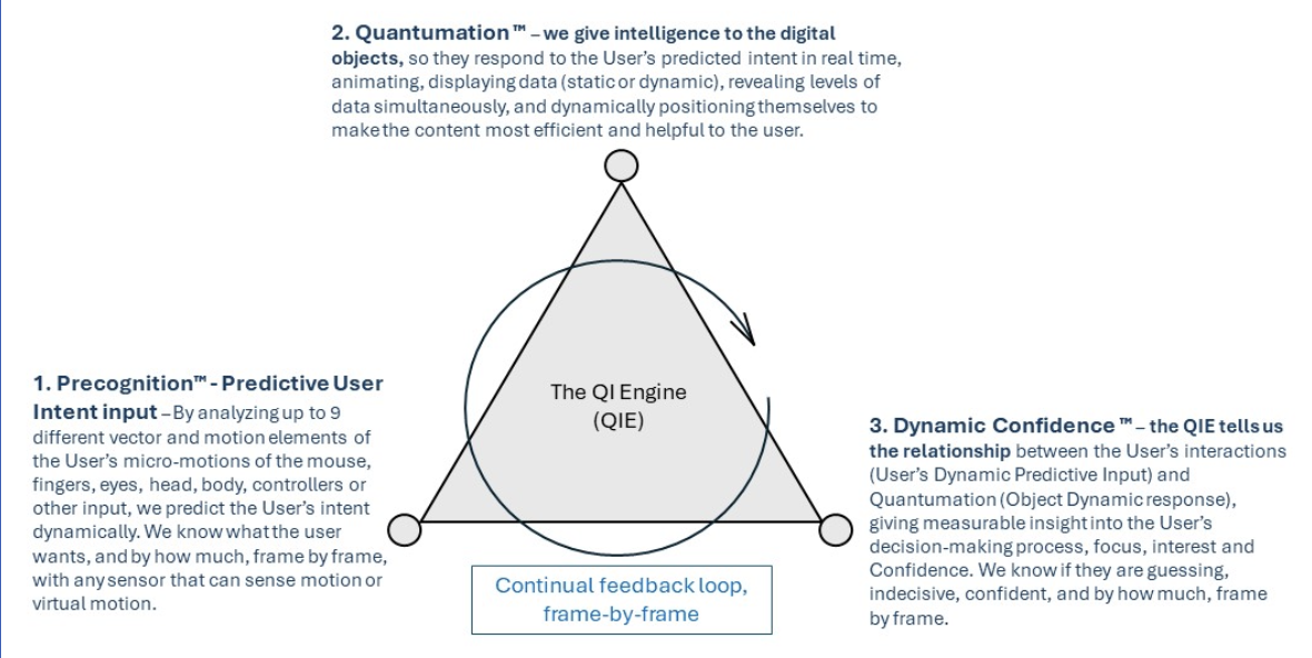 Our Quantum Interface Engine (QIE) spatial interface – the only one of its kind - represents a significant departure from traditional user interfaces. Our proprietary system uses vector and arcuate analysis of the user’s actions in real time, incorporating physics and mathematics to predict user intent moment by moment. Objects (content, media, text, data, attributes, etc.) within the system respond to the user’s intent dynamically and fluidly in real time. The relationship between the user and objects is quantified as the Dynamic Confidence™ of the user.